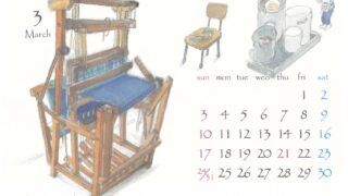 画家・伊東雅江さんの「鎌倉カレンダー」2019年3月より。「古民家で紡ぐ鎌倉の色」という催し物の案内を図書館で見つけました。鎌倉の野山・道端などに生えている植物で糸を染めてその糸を紡ぎ布を織る、染織家たなか牧子さんからお話を聞くセミナーでし...