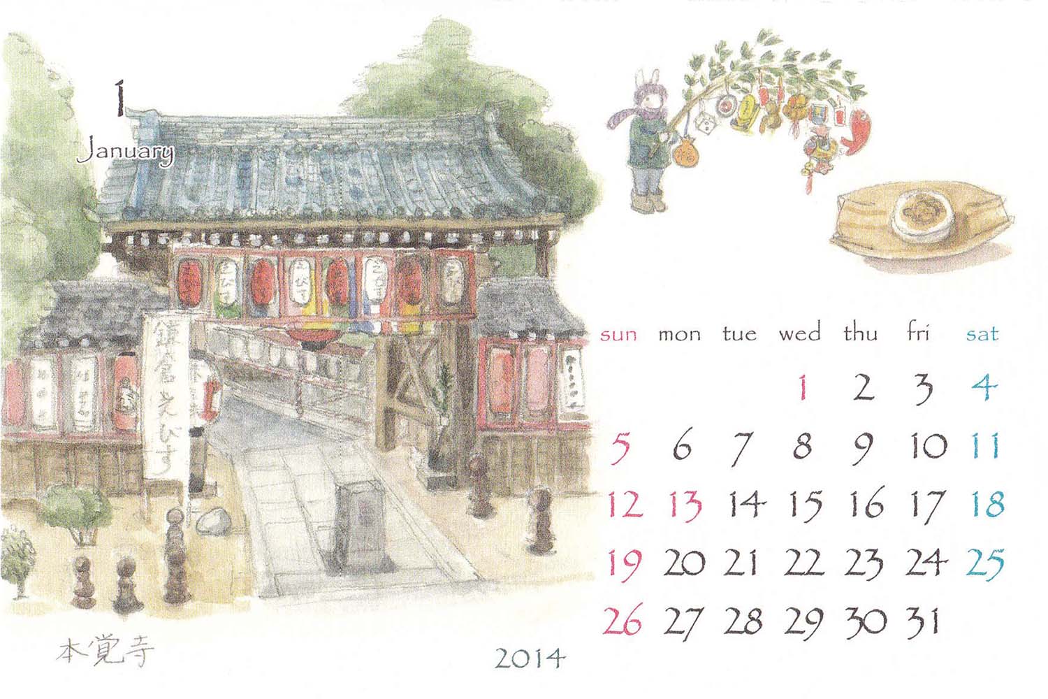 画家・伊東雅江さんの「鎌倉カレンダー」2014年1月より。
