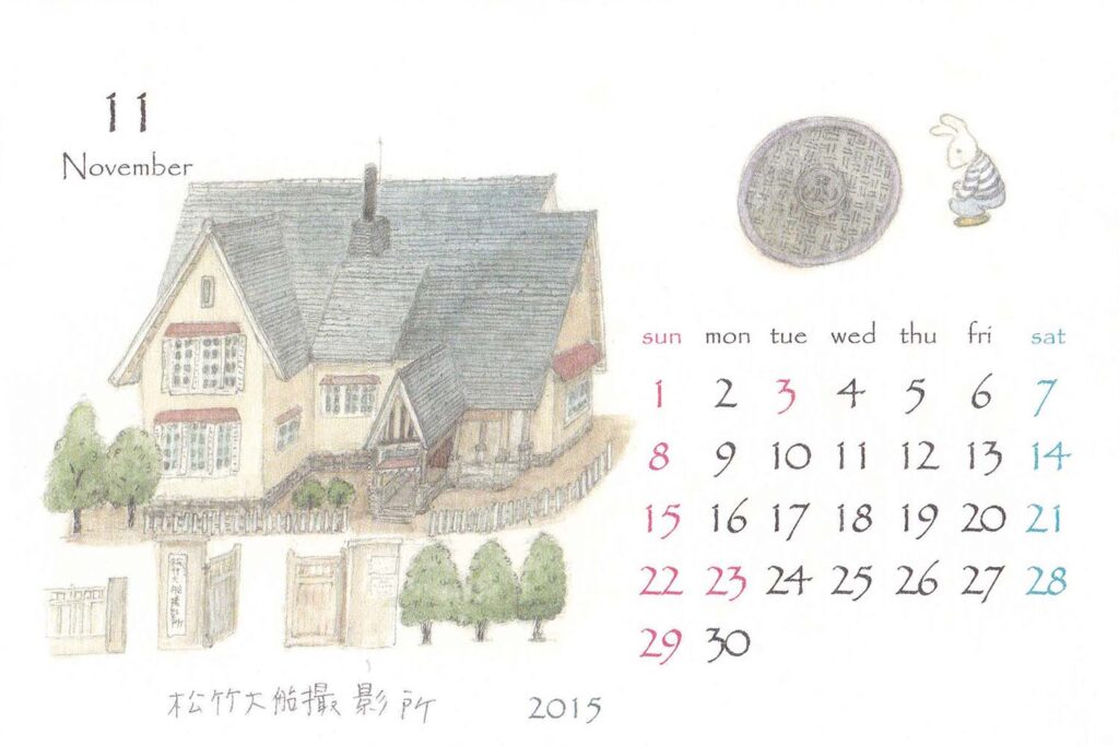 カレンダーの左側に描いた建物は、かつて大船撮影所の門を入るとすぐに見えた建物で、川喜多の展示写真をヒントに調べて描さました。これは大船田園都市構想を推進した渡辺銀行の渡辺六郎氏の邸宅を移築した建物で、撮影所開所当時は所員の親交を深めるクラブとして使用され、後に宣伝部、スチール、映写部が使っていました。右上には先にも触れたマンホールを描きました。