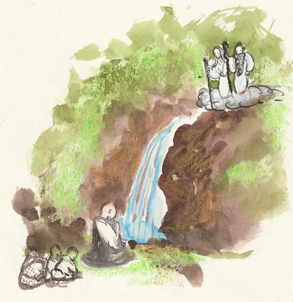 雲間からさす光に導かれ、空海が山奥深くまで進むと、どこからともなく翁と媼(男女の老人)が現れ言いました。