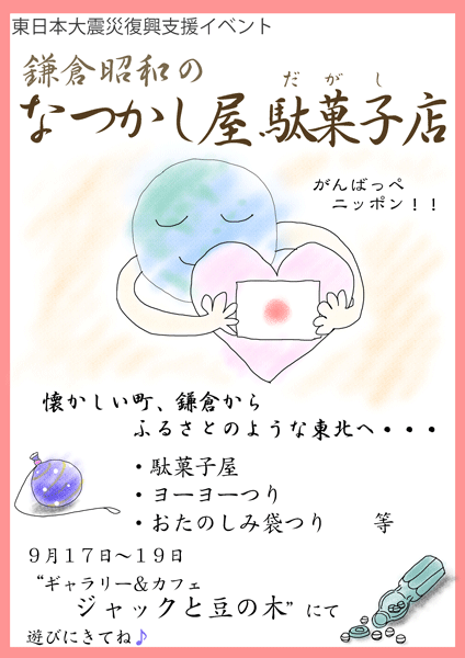 さらに、なつかしい鎌倉からふるさとのような東北へ、復興チャリティーの意味を込めて、「なつかし屋 駄菓子店」を会期中の9/17,18,19日にジャックと豆の木の前で開きます。これは由比ガ浜商店街の復興チャリティーと連動しています。アメやキャラメル、麩菓子などのレトロな駄菓子のほかヨーヨー釣りもお楽しみいただけます。