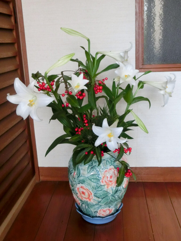 沖永良部島から届いたテッポウユリです。お正月にはきれいに咲きました。