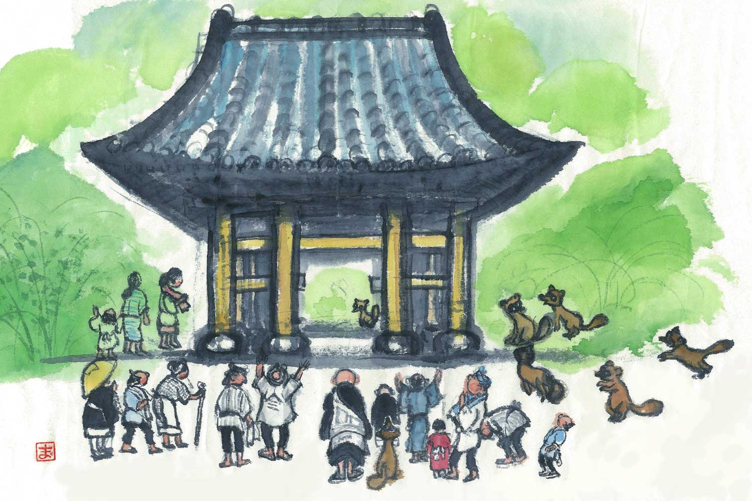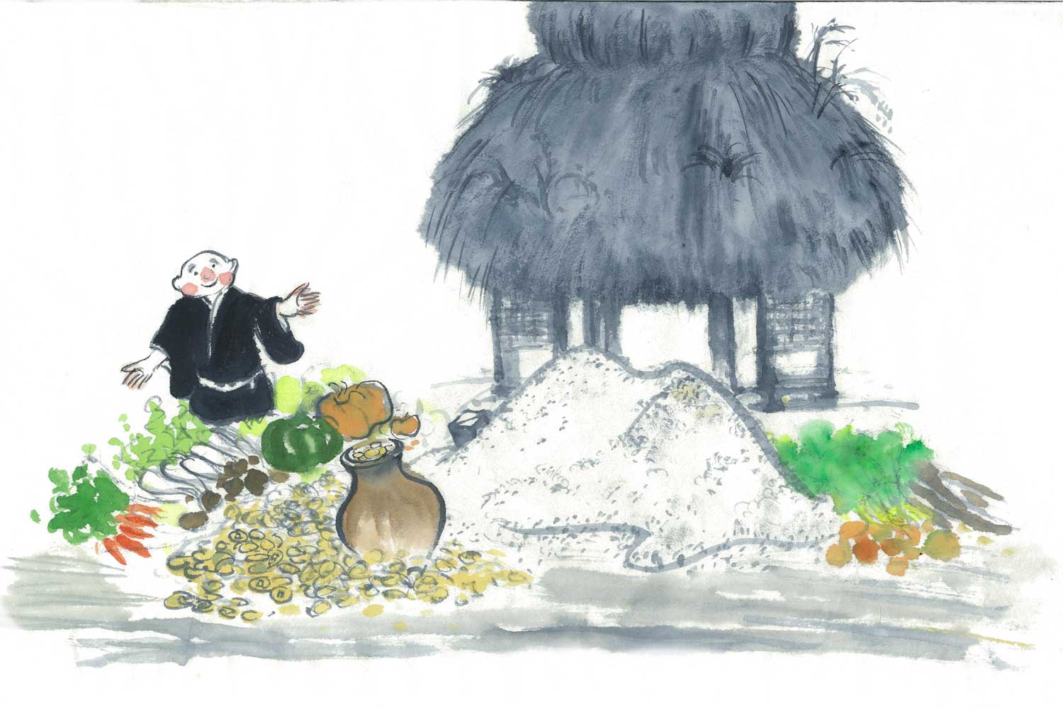 こうして集めたお金や食べ物を、たぬきたちは、三門の前にどっさりおいていきました。万拙和尚さんのよろこんだことといったら!