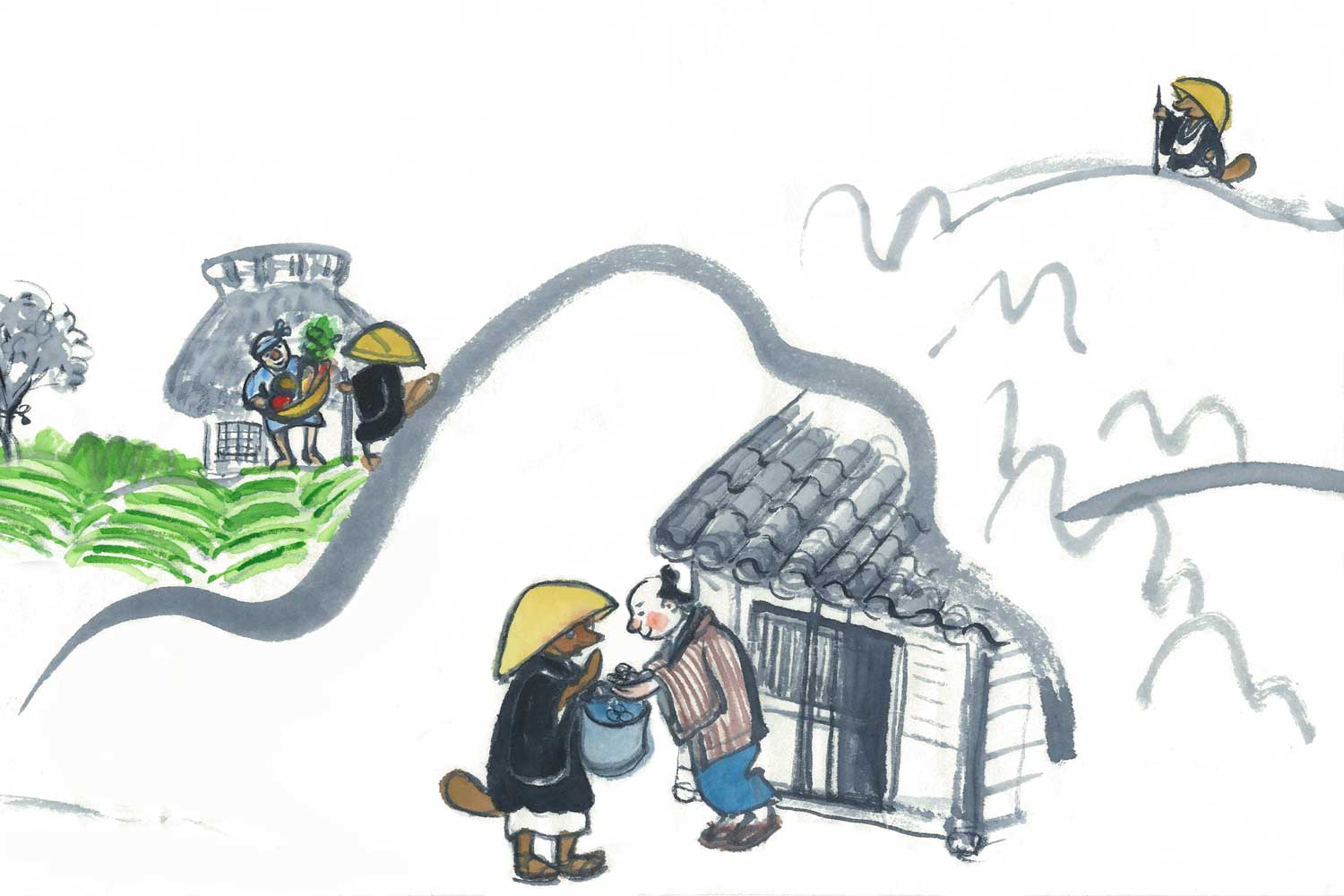 たぬき和尚たちは山をこえて町や村へ。ずいぶん遠くまで托鉢して寄付をもらいました。