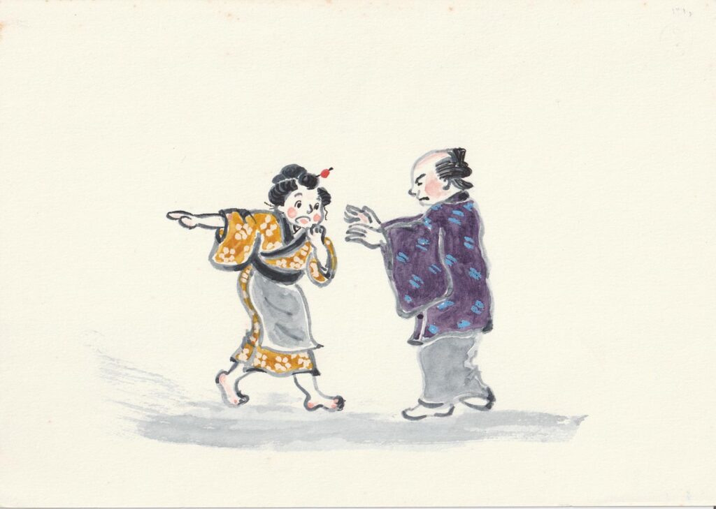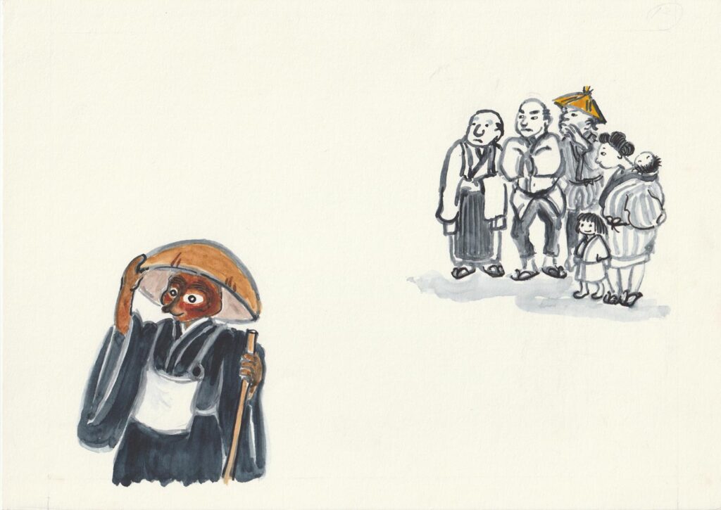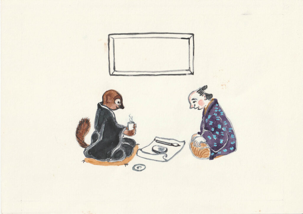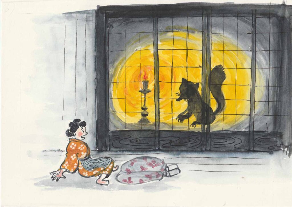 その晩、女中が廊下を通り過ぎようとすると、部屋の障子にたぬきの姿が映っています。