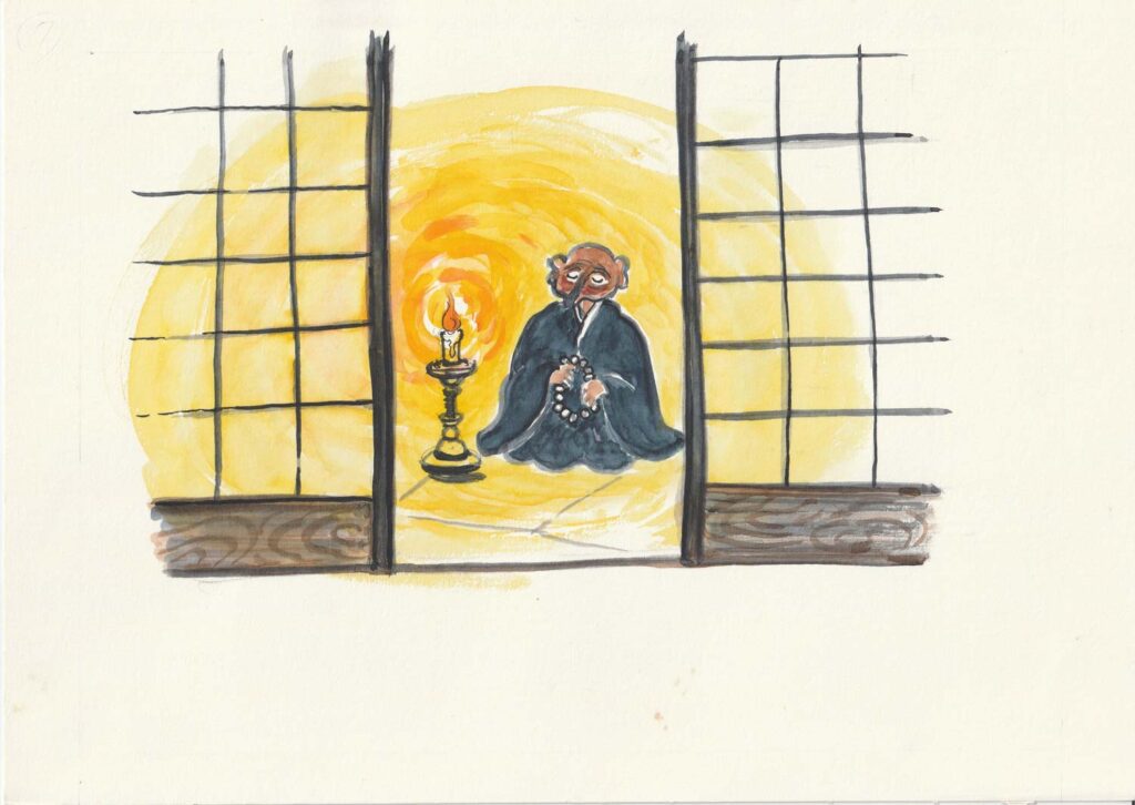 びっくりして声を掛けて障子を開けると、座っているのはお坊さんです。