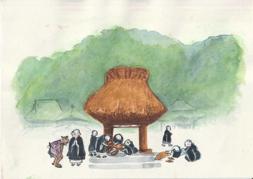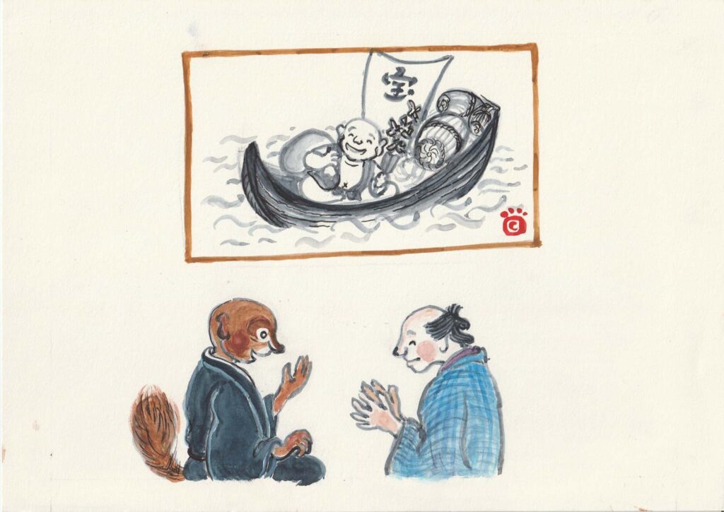 そこでも書き物を頼まれたお坊さんは、今度はなにやらおめでたい絵を描きました。