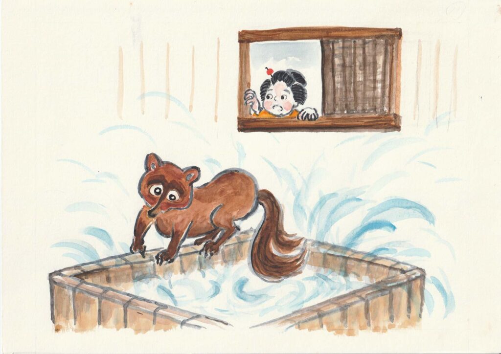 お坊さんが風呂に入っているとき、ボチャボチャと水音がしたので通りかかった女中が覗いてみました。するとお坊さんに尻尾があって、それを洗っているではないですか。