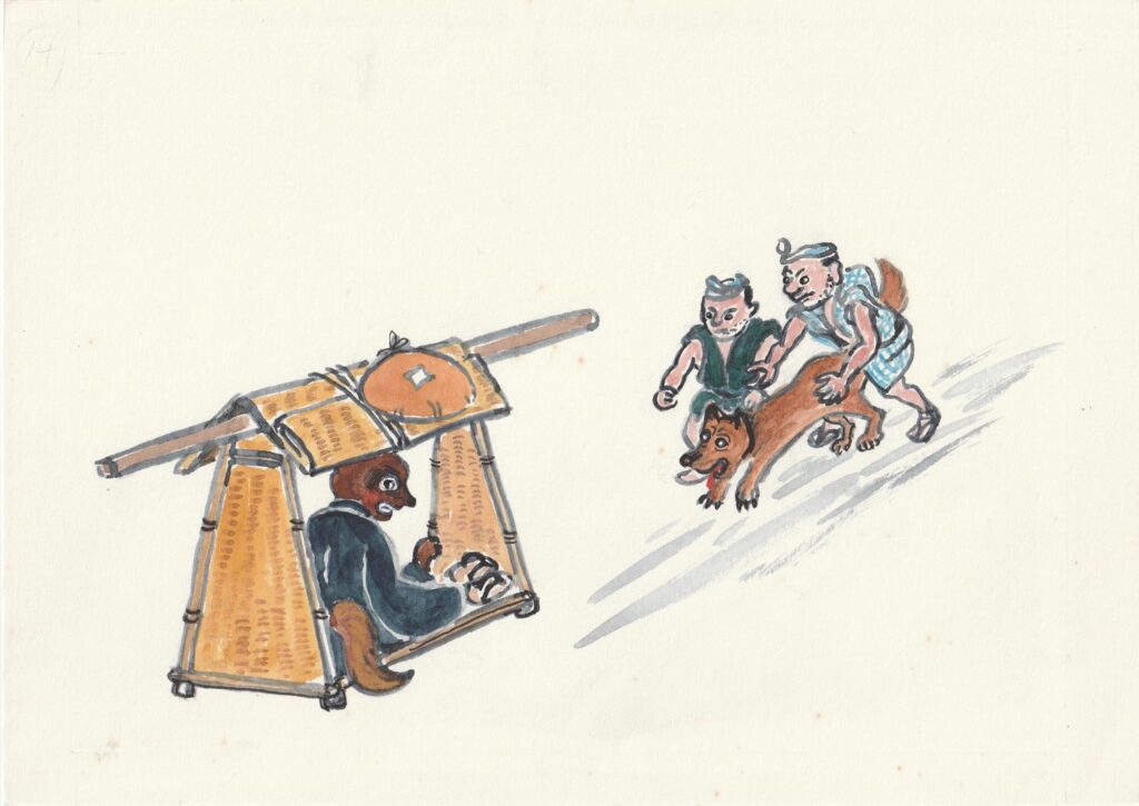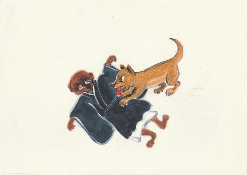 駕籠かきは、この和尚の正体を見てやろうと、一匹の犬をけしかけてみました。