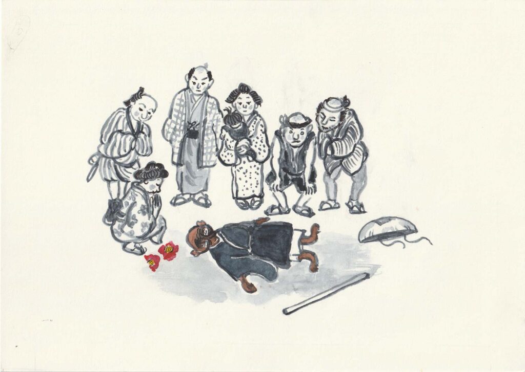 真っ青になって「お坊さんを殺してしまった」と役人に自首しました。それから七日過ぎにようやく古狸が正体を現しました。駕籠かきは無罪放免となりました。